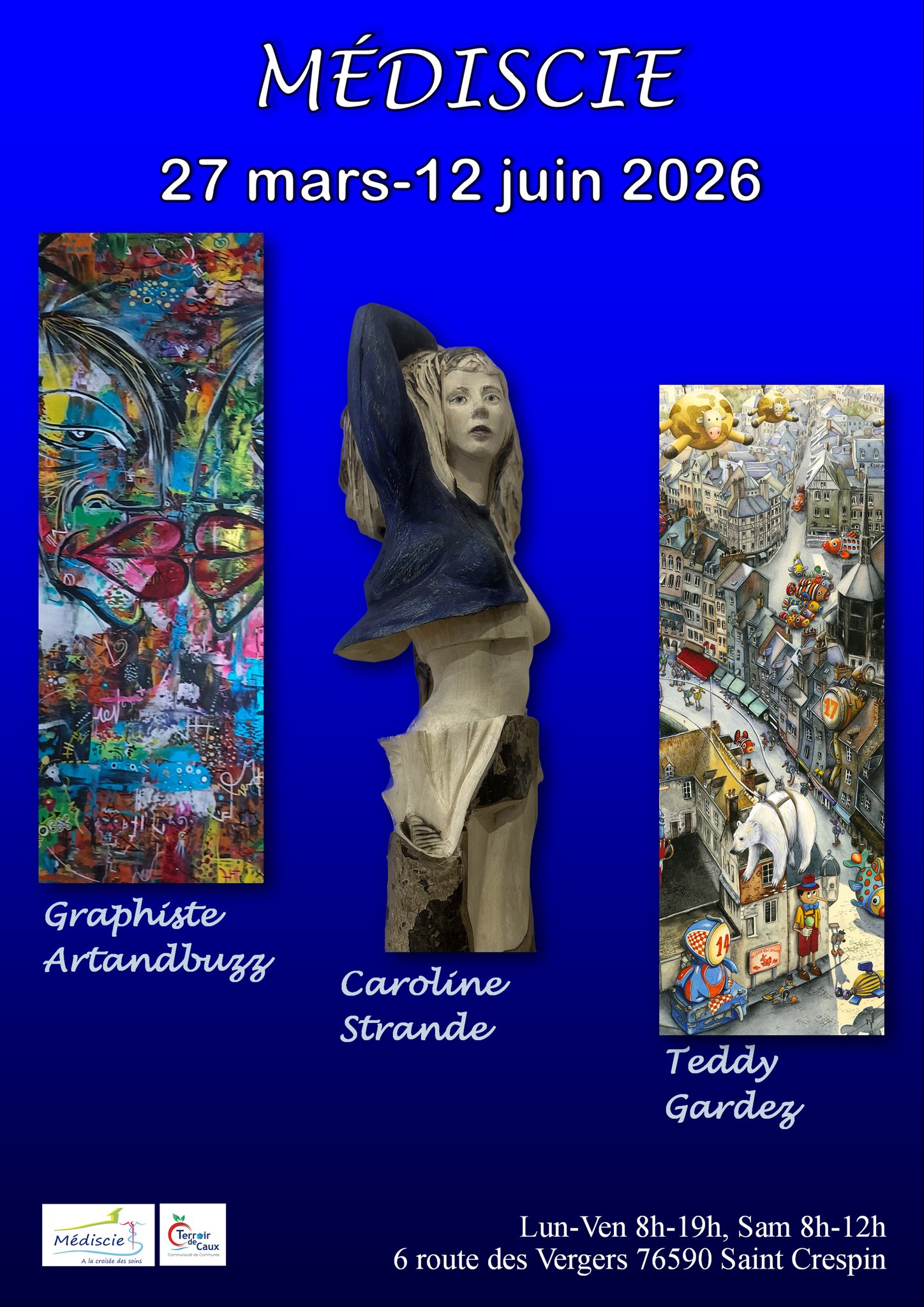 Cette fois ci ce seront trois artistes qui envahiront Médiscie avec leurs œuvres Teddy Gardez, Graphiste Artandbuzz, et Caroline Strande.